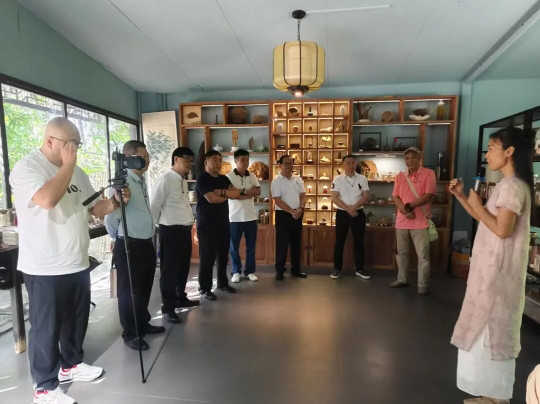 然后赴副会长单位舍得坊沉香黄花梨收藏馆参观交流。负责人陈耀杰为我们分享舍得坊品牌的创建情况和当下的市场行情。