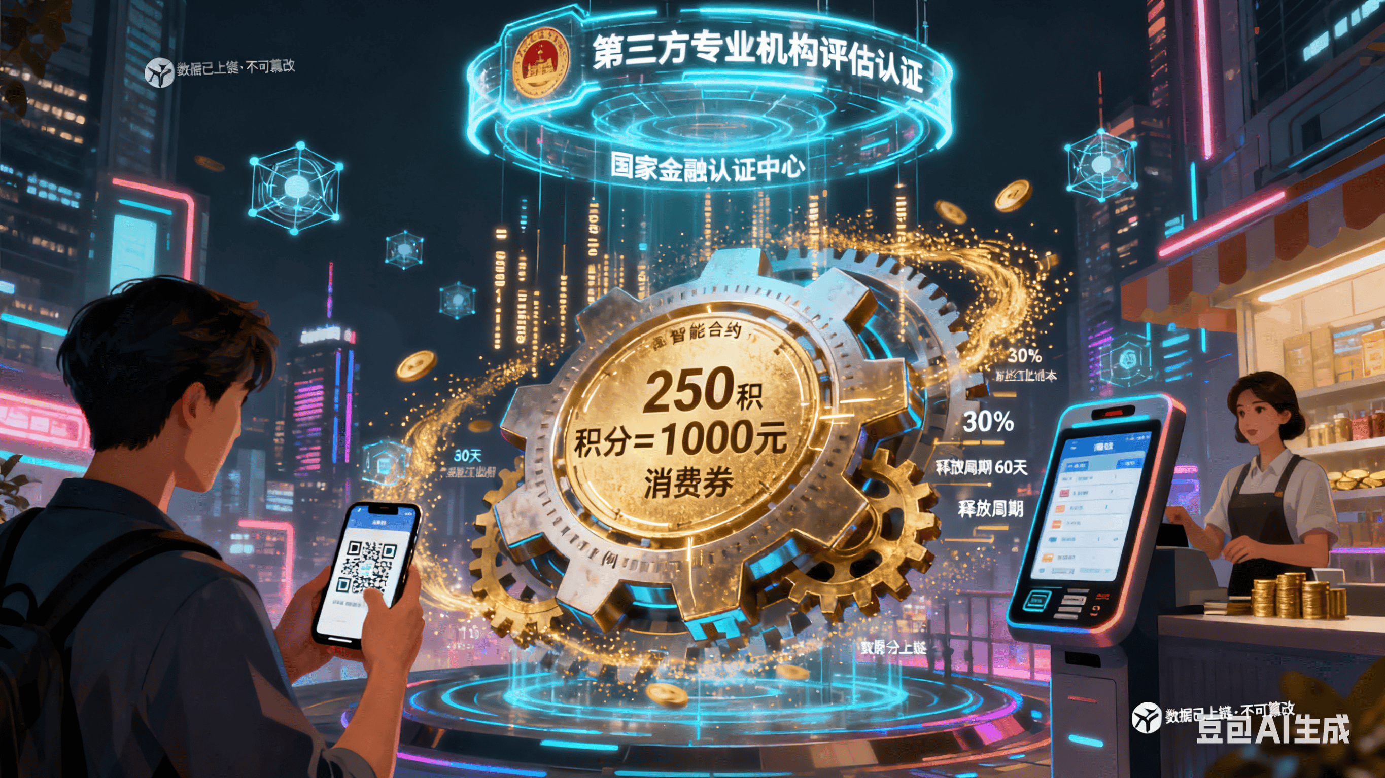传统模式中,积分是平台内部“虚拟权益”,价值由平台单方面决定,用户权益难保障。而“我店模式+RWA”中,积分上链成数字通证,价值由第三方专业机构评估认证。如250积分对应1000元消费券兑换权写入智能合约,分红比例、释放周期等关键信息自动执行且数据不可篡改,用户和商家可随时查询,解决信任问题,让积分价值更透明可靠。