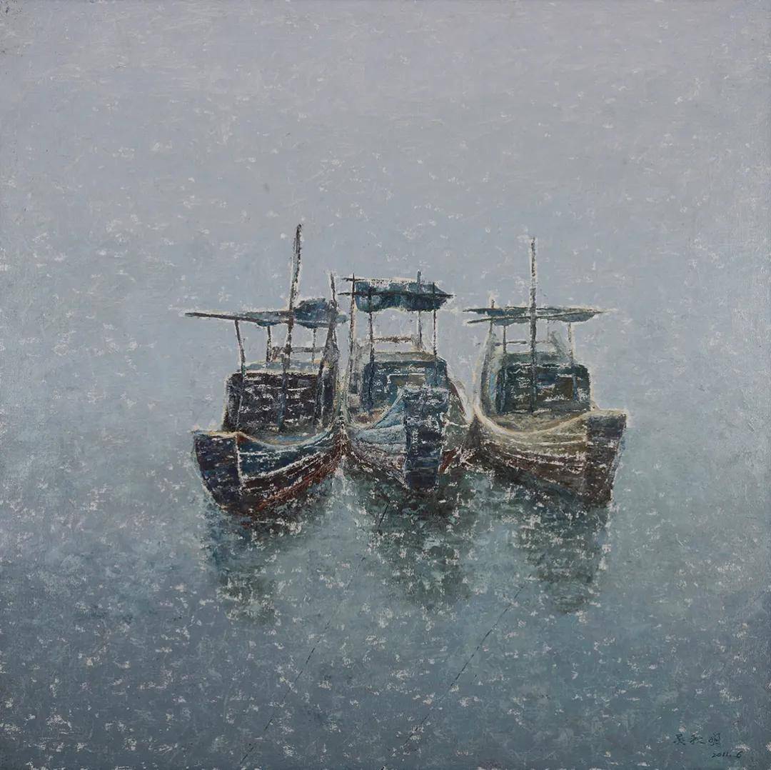 一幅幅赏读,他的这些油画作品浸曼着他的气质与情怀,中国写意之精神。这些油画作品我似乎可以探寻到他的探索之路。其笔下表现出的是气象、气势与气魄,也表现出他的阳刚之美,丈夫之气,其实“气”是中国哲学的重要范畴,《说文解字》释为“气,云气也”。云之千变万变,流动奔腾,升降聚散,随气而流,随风而动。儒家讲君子之风,浩然正气。释家愠色空之间,气兼有无。道家曰:“万物负阴而抱阳,冲气以为合”,“精气为物”。中医的望闻问切,武术中的剑气如虹,舞蹈中的长袖善舞;个人身体差异讲“气色”,人与人相交讲“气场”等,无不与气相关。有气则生,无气则滞。我们中国绘画艺术与“气”最为讲究。六朝谢赫画论之六法首推“气韵生动”,因有气韵画面才能产生动感,才能如源头活水。应该说:“气韵”是绘画艺术的灵魂,因气韵而产生节奏旋律与意境。但气韵在绘画中则玄之又玄,书画中的气韵在作者与观者而言都是只可意会,难以言传的。即只能感觉与体会,只能用心去感悟,所谓心领神会。