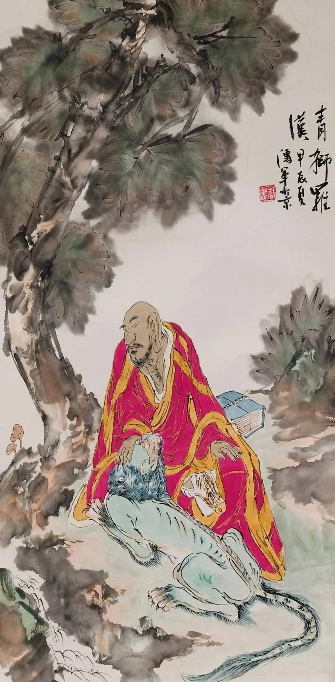 其三为意境生动。明代画家龚贤提出创作山水画应有“笔法、墨气、丘壑、气韵”,与谢赫“六法”相较,其中“丘壑”点明山水画与人物画创作的最大差异,此“丘壑”亦可理解为“境界”。清初画僧石涛晚年所提“画出人间无有之境”,此“境”与“丘壑”类同。方传军深知佛法在世间,不离世间法,罗汉形象不应高高在上,而是身边的一位修行者。故而,方传军喜欢把罗汉隐于山水间,或独自修行,或传道授业,甚至与虎兽相伴。恰似唐末画僧贯休诗文《题宿禅师院》所云“身闲心亦然,如此已多年”,罗汉修行心境与自然、生活环境相呼应,方能知行合一,画面意境鲜活,令人感悟。