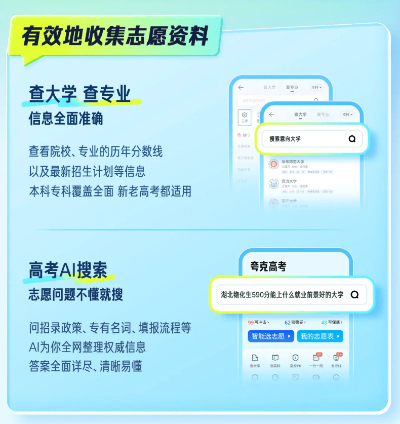 与大模型发布同时,夸克一并上线“高考深度搜索”“志愿报告”“智能选志愿”三大核心功能,且拥有完善的高考知识库。