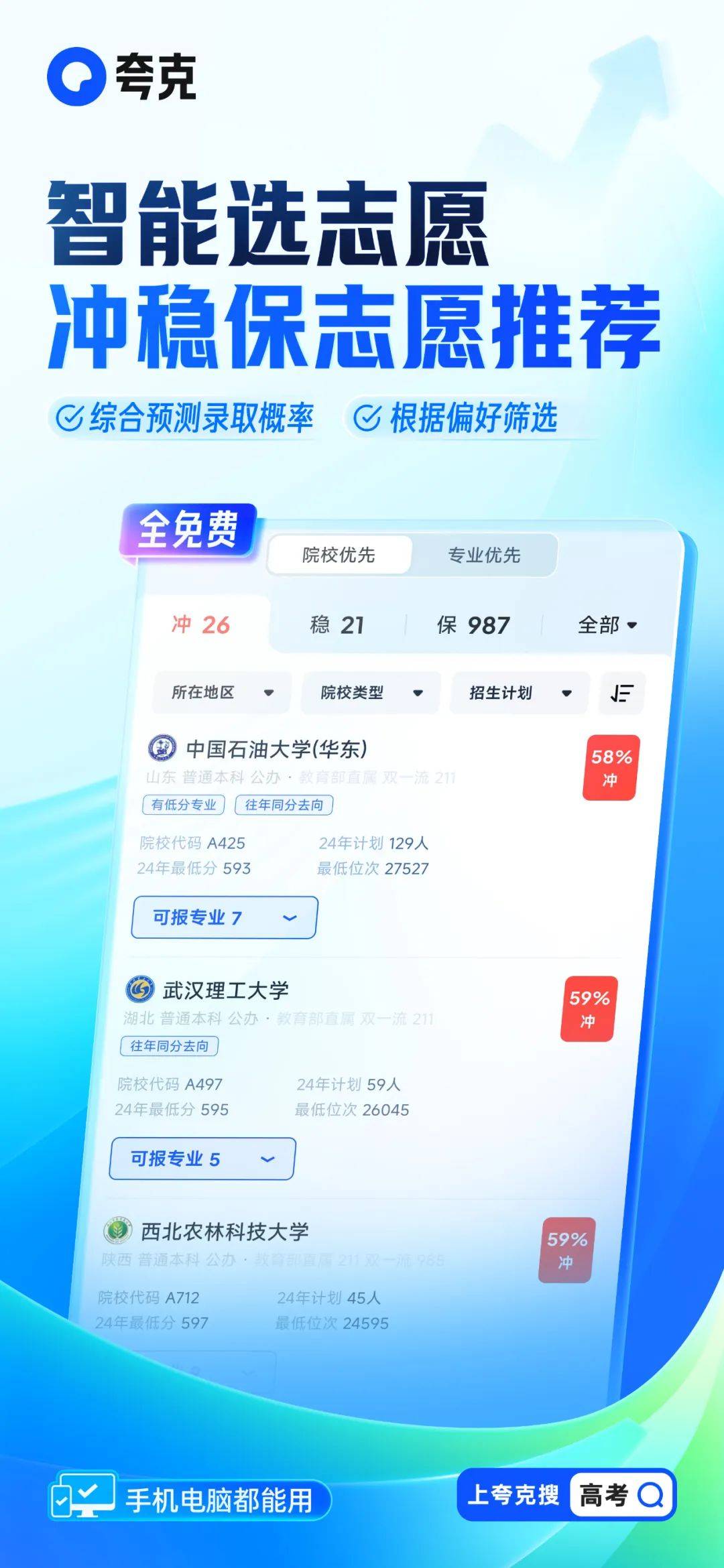 越是信息相对闭塞的地方,信息服务的价值越大。受现实条件影响,县域高中、偏远地区考生对AI大模型的接触度较低。为了让他们能毫无障碍地用上夸克高考志愿大模型,今年夸克专门新增支持电脑端,手机、电脑均可使用,且在志愿详情页增加了AI分析功能,可以为考生总结高校和专业特色。