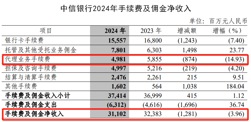 代理业务手续费的收缩态势明显。从2020年的75.27亿元,回落至2024年的49.81亿元,五年缩水33.82%。