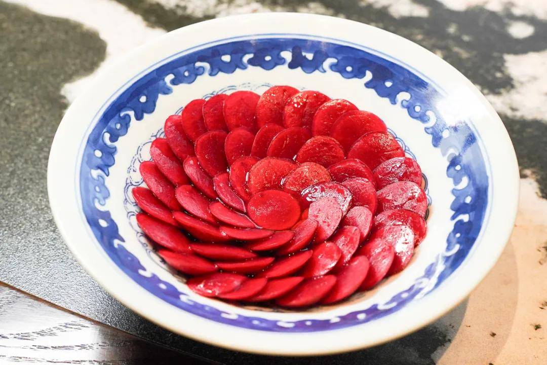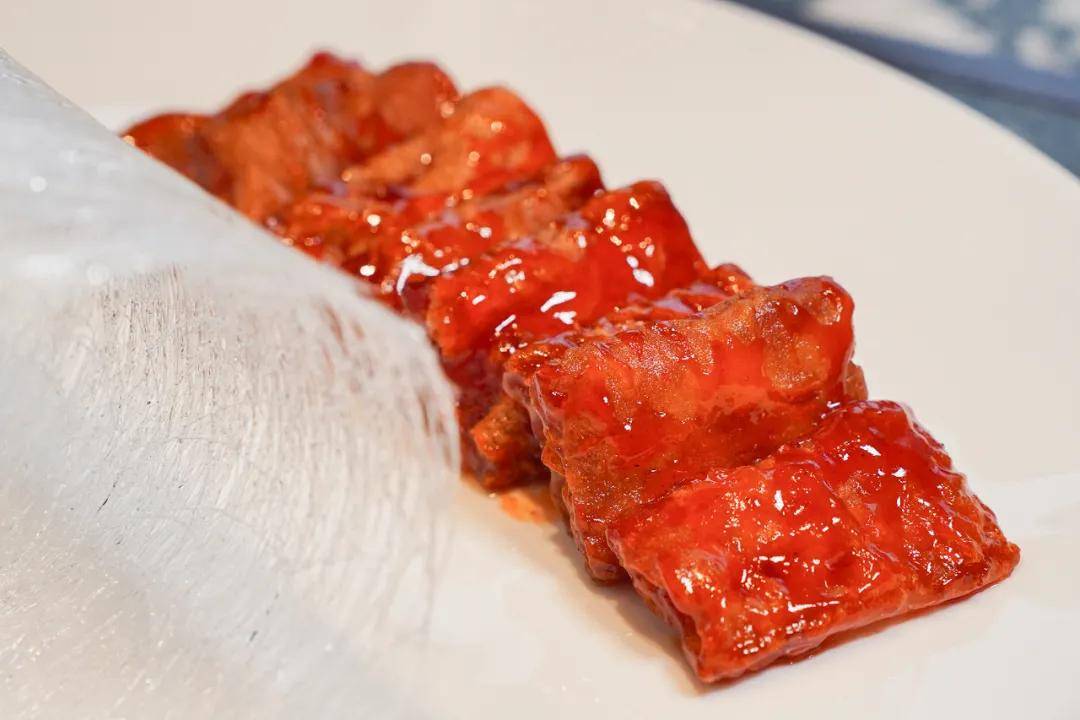 冰烧三层肉:采用的黑毛猪肉,经过长时间高温将皮与肉之间的油脂去掉,最终形成拱桥的形状,它的皮又厚又蓬松,吃起来又酥又脆还不肥腻,上面点缀黄芥末,让口感有了层次感。