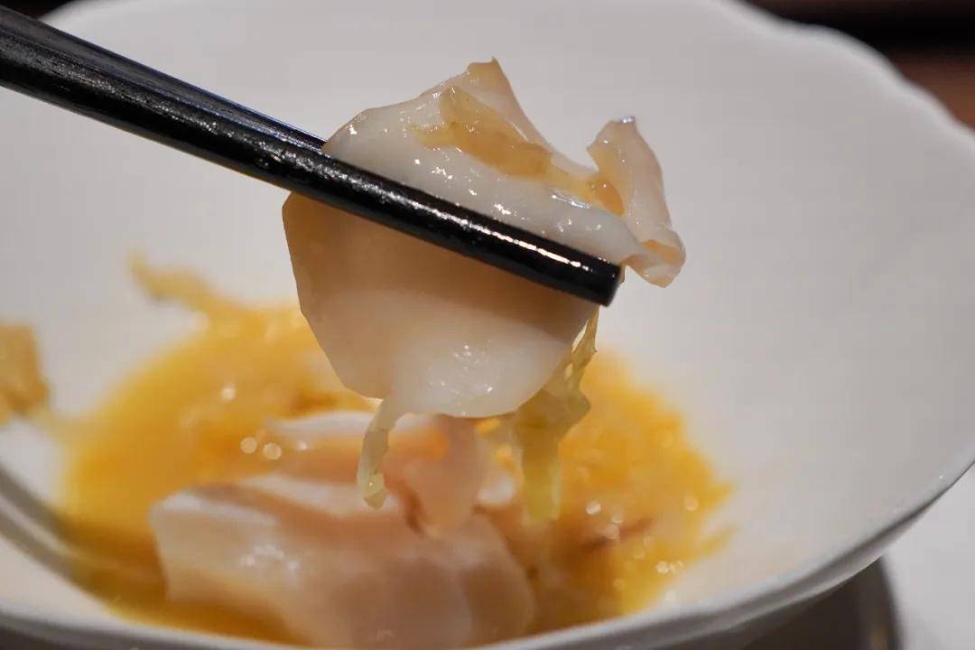 今宴有一道隐藏菜品:松叶蟹醋冻海胆鱼仔酱,这可是需要预约才能吃到的菜品。每个字都是不同的材料,蟹是松叶蟹,醋是黑醋汁,冻是百香果冻,加了黄秋葵,海胆来自于大连,鱼子酱的品牌是卡露伽。组合在一起,味道简直绝了!