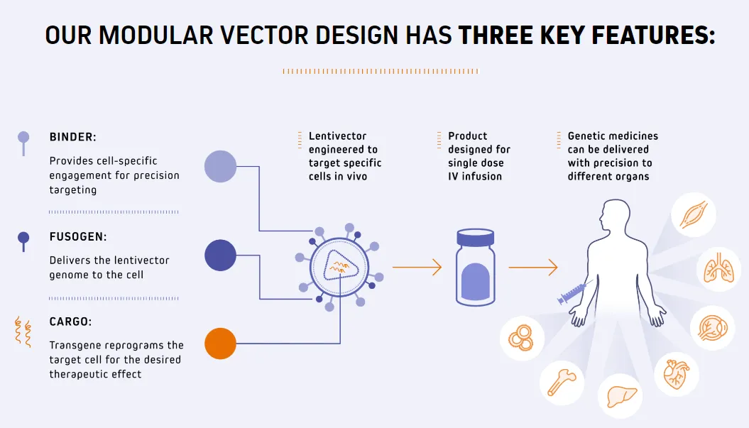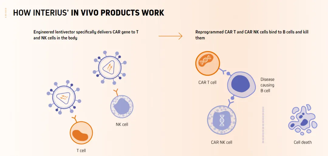 此次收购通过整合Interius的体内集成平台,补充了Kite在细胞治疗的管线。这种方法可以直接在患者体内产生CAR-T细胞,并通过将DNA插入患者的基因组中提供更持久和持久的治疗效果。与需要细胞采集、工程化和再融合的传统CAR-T疗法不同,Interius的创新、现成但个性化的方法旨在通过单次静脉输注提供,消除了清淋预处理和复杂细胞处理的需要。
