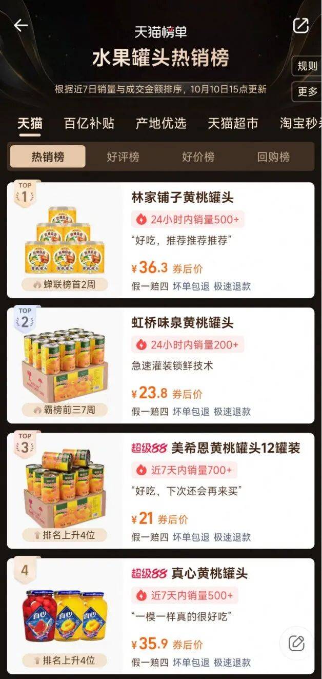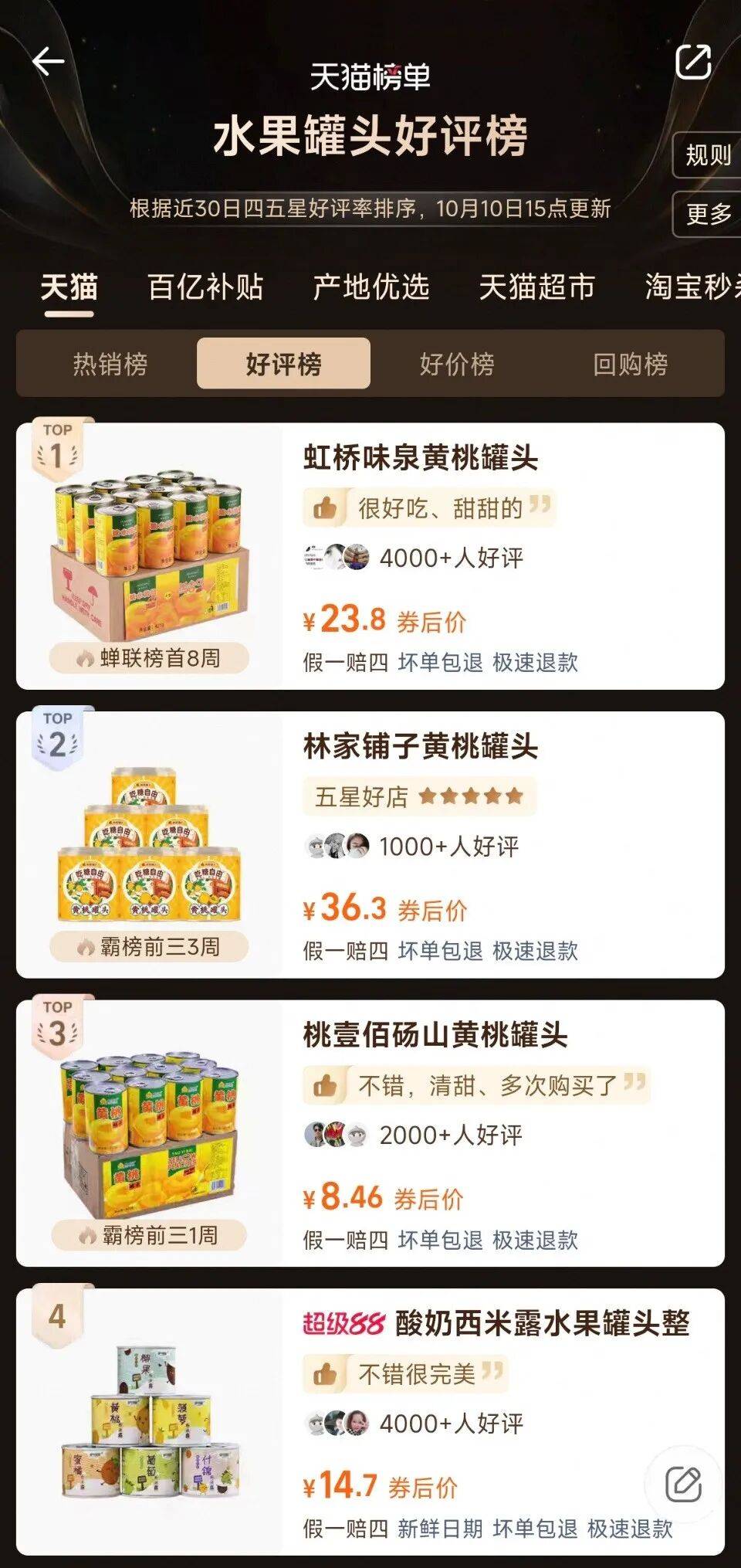 而天猫平台的“水果罐头”好评榜和回购榜里,销量前三分别是虹桥味泉黄桃罐头、林家铺子黄桃罐头、桃壹佰砀山黄桃罐头和虹桥味泉黄桃罐头、伊寻园黄桃罐头、应季物语果汁罐头,欢乐家只在天猫回购榜里排第20名。