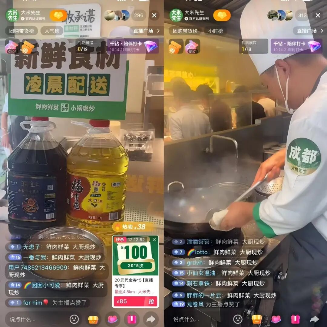 “我们的牛肉、梅花肉都很新鲜,家里用的是什么调料,我们就用什么调料,隔夜饭不可能出现。”在大米先生的抖音直播间内,主播一边展示着自家的“明厨亮灶”,另一边BGM是锅铲与锅碰撞出的“铛铛”声。