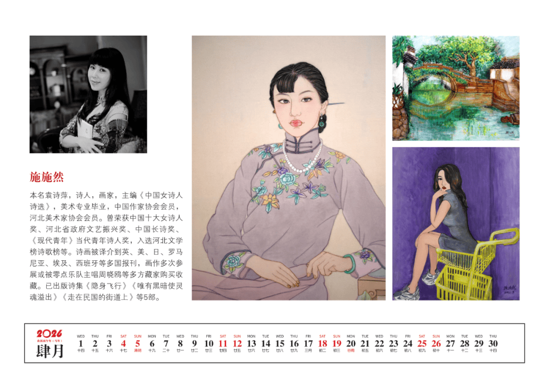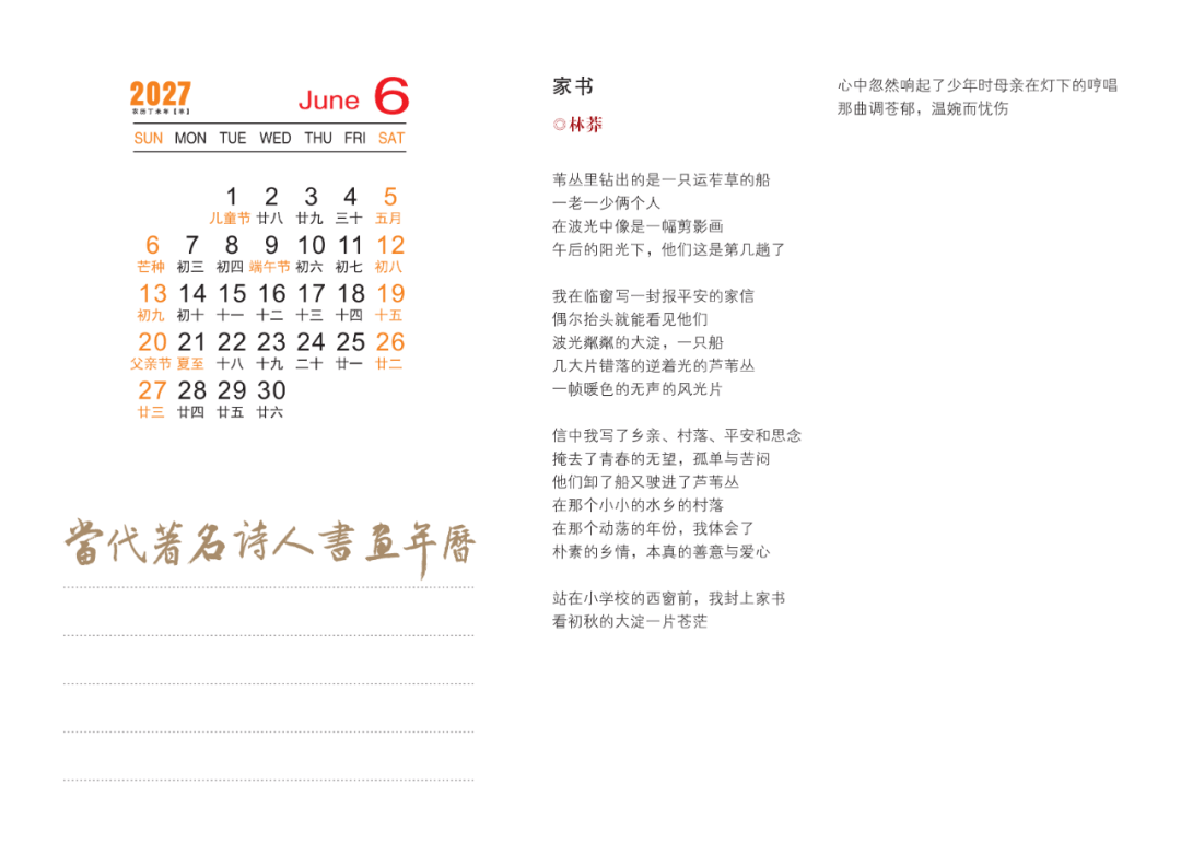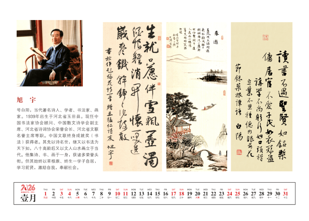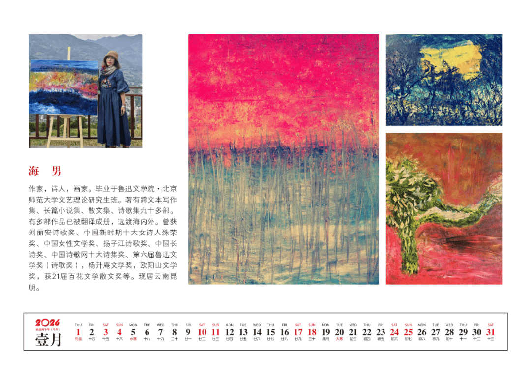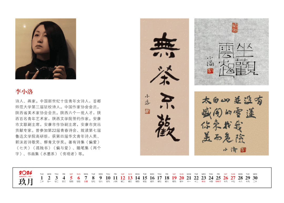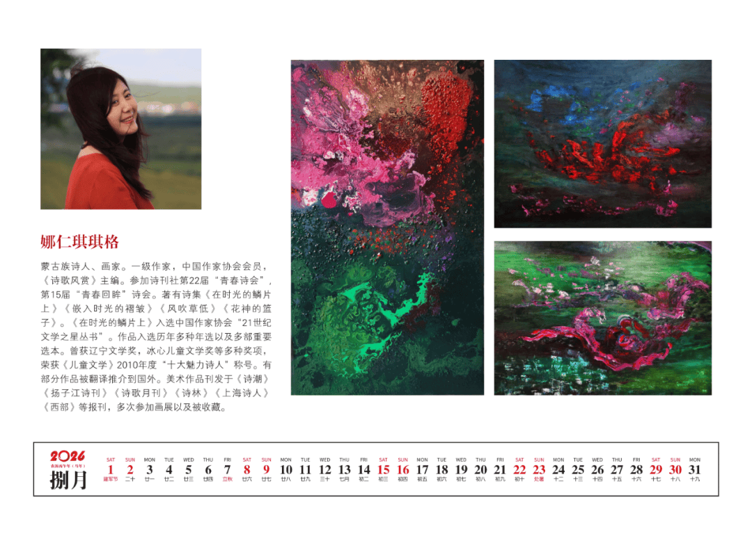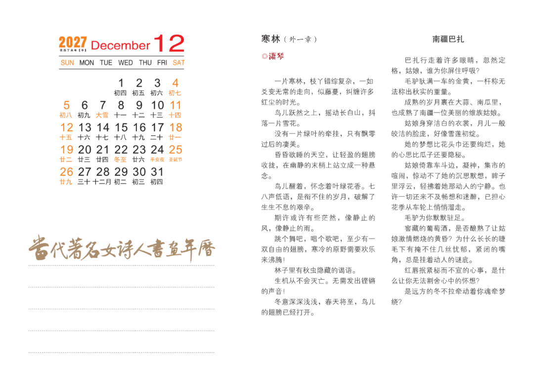 这本年历可谓独具匠心,让人在举首之间感受到诗书画的交融,墨香与色彩的共舞,精神与诗意的远游。方寸天地间,每一幅画皆可入诗,每一笔书法皆似琴音,每一行诗句均绽放出美的神韵。转眼一年飞逝,悲与喜,苦与乐,皆在这一点一线、一笔一划、一字一诗中徜徉。愿我们沉浸在书香画趣里,为诗意的生活增添一抹高雅的亮色。