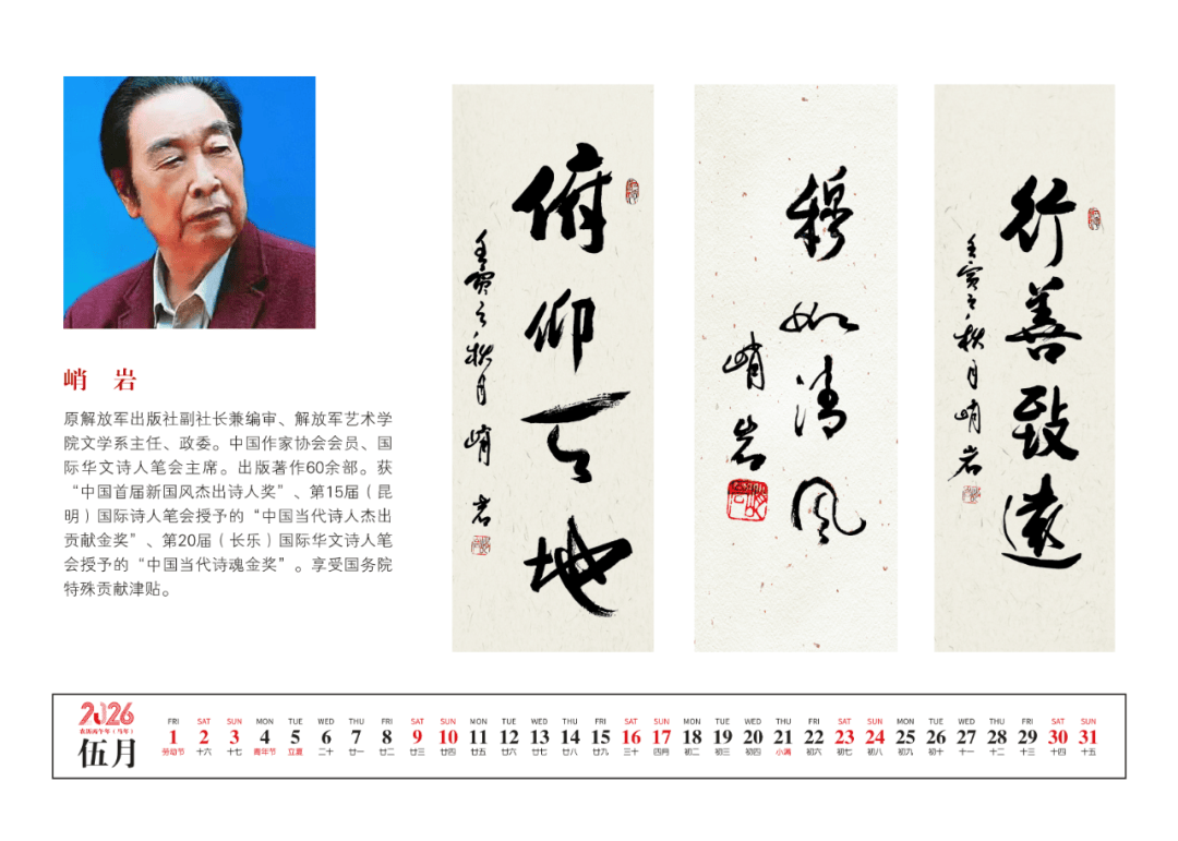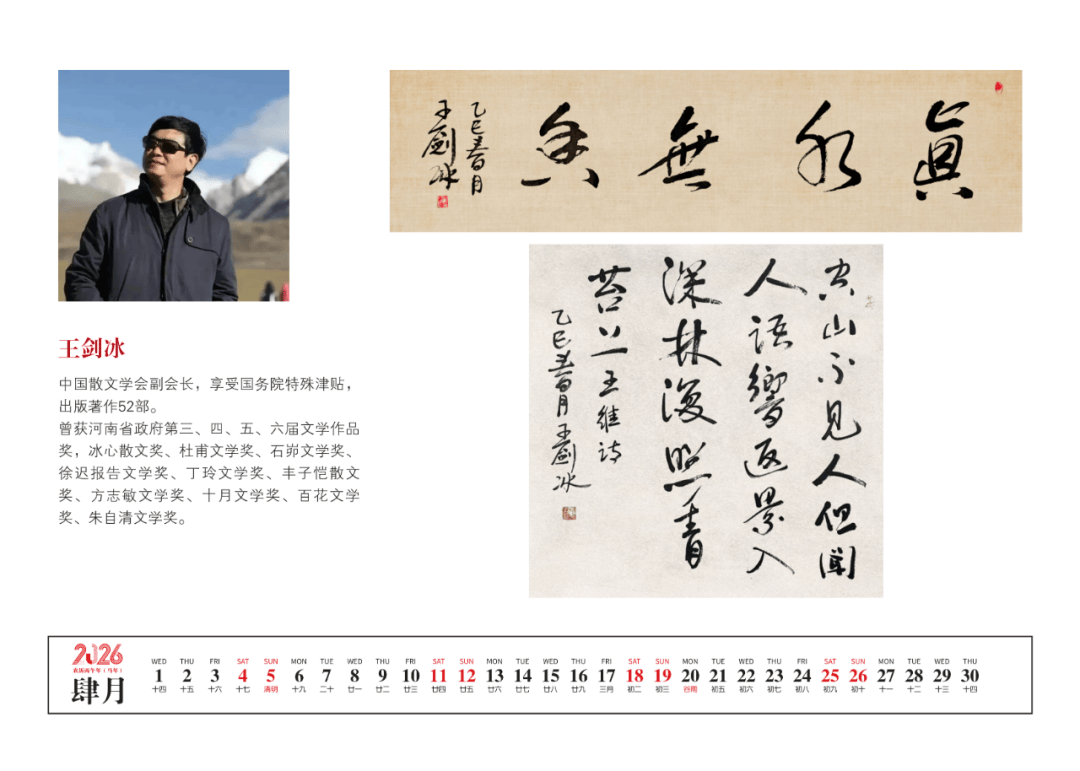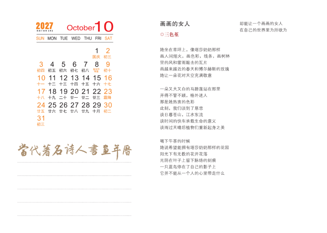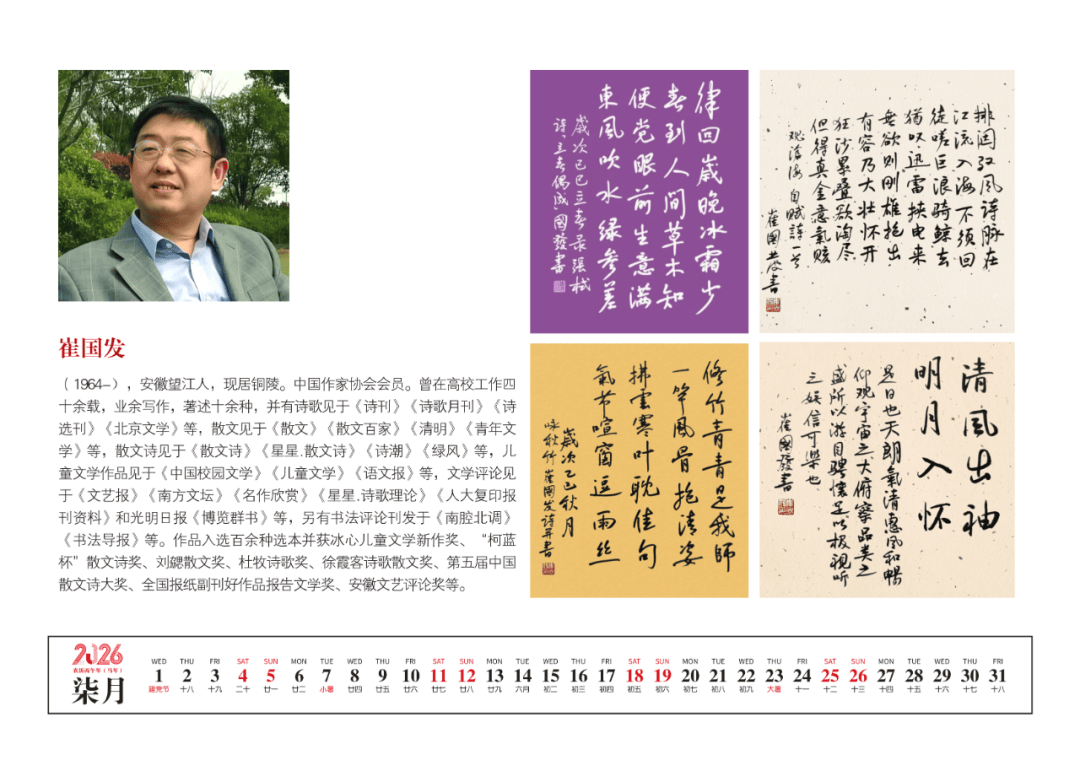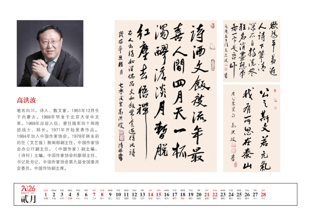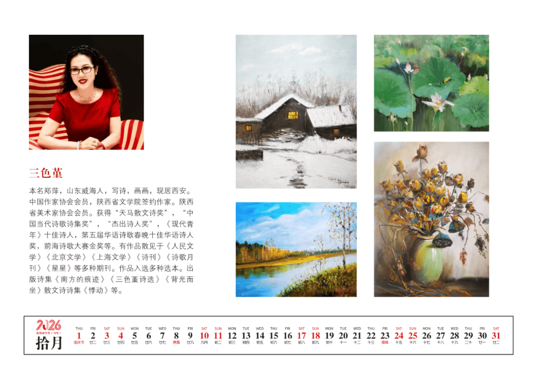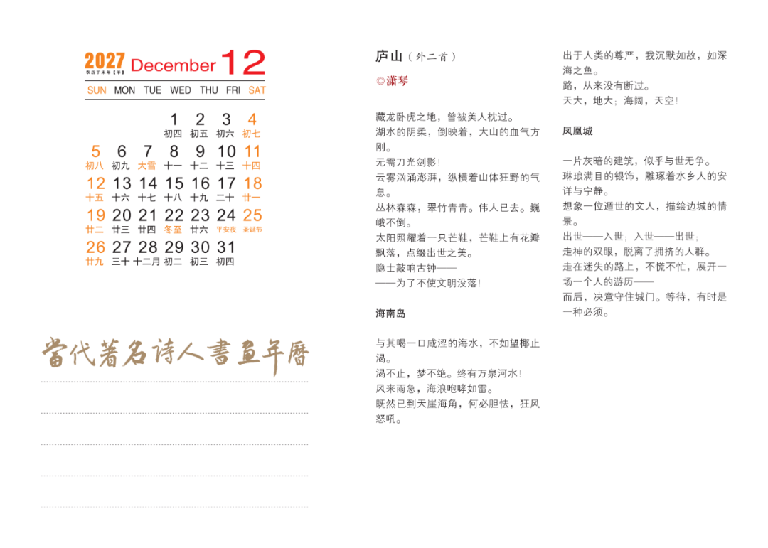这本年历可谓独具匠心,让人在举首之间感受到诗书画的交融,墨香与色彩的共舞,精神与诗意的远游。方寸天地间,每一幅画皆可入诗,每一笔书法皆似琴音,每一行诗句均绽放出美的神韵。转眼一年飞逝,悲与喜,苦与乐,皆在这一点一线、一笔一划、一字一诗中徜徉。愿我们沉浸在书香画趣里,为诗意的生活增添一抹高雅的亮色。