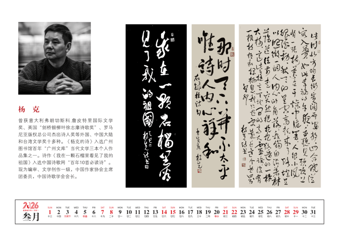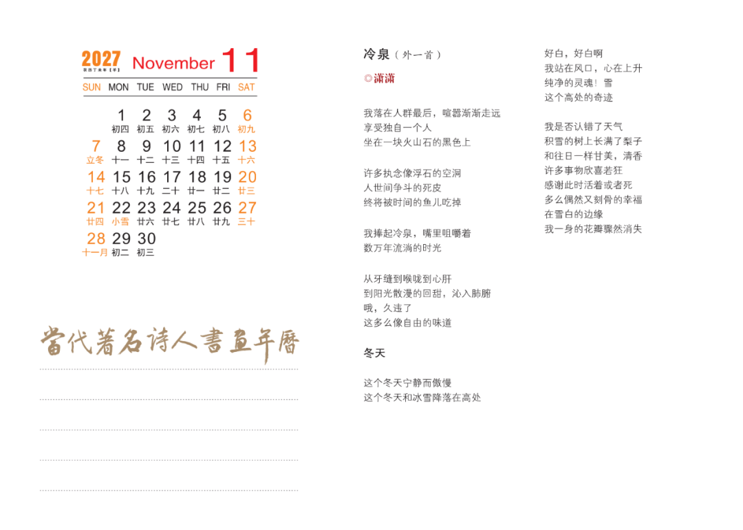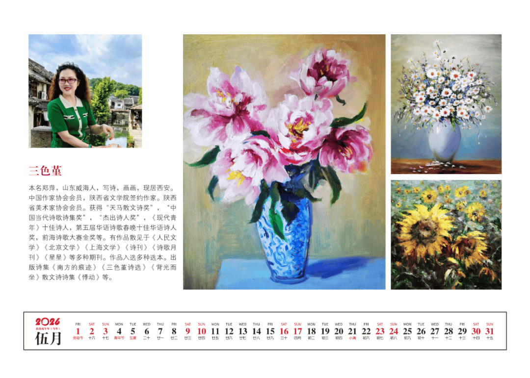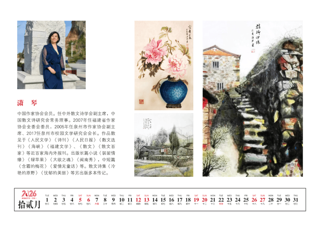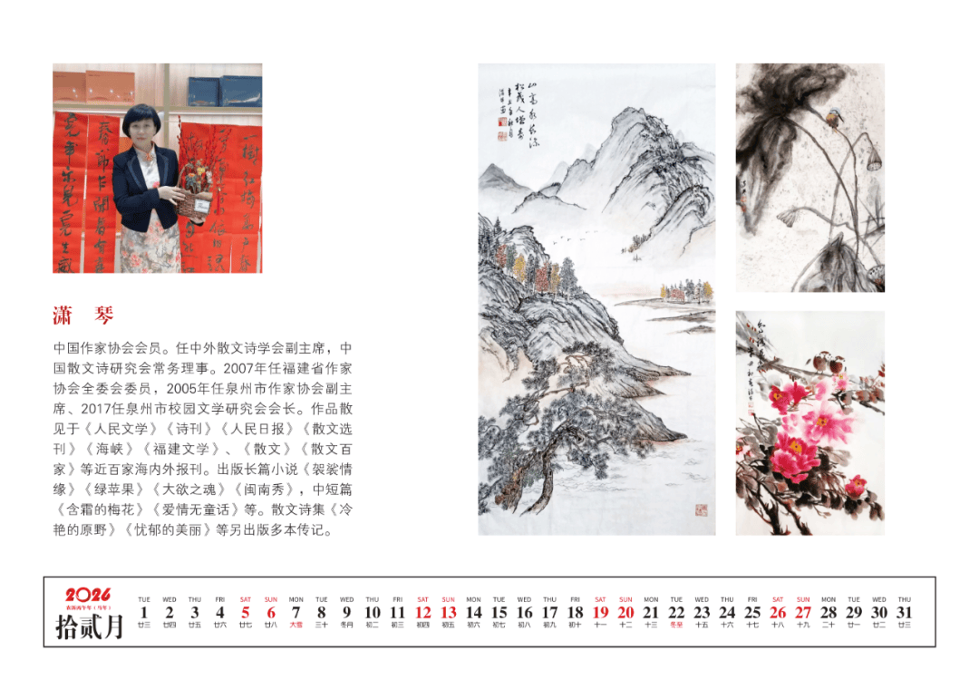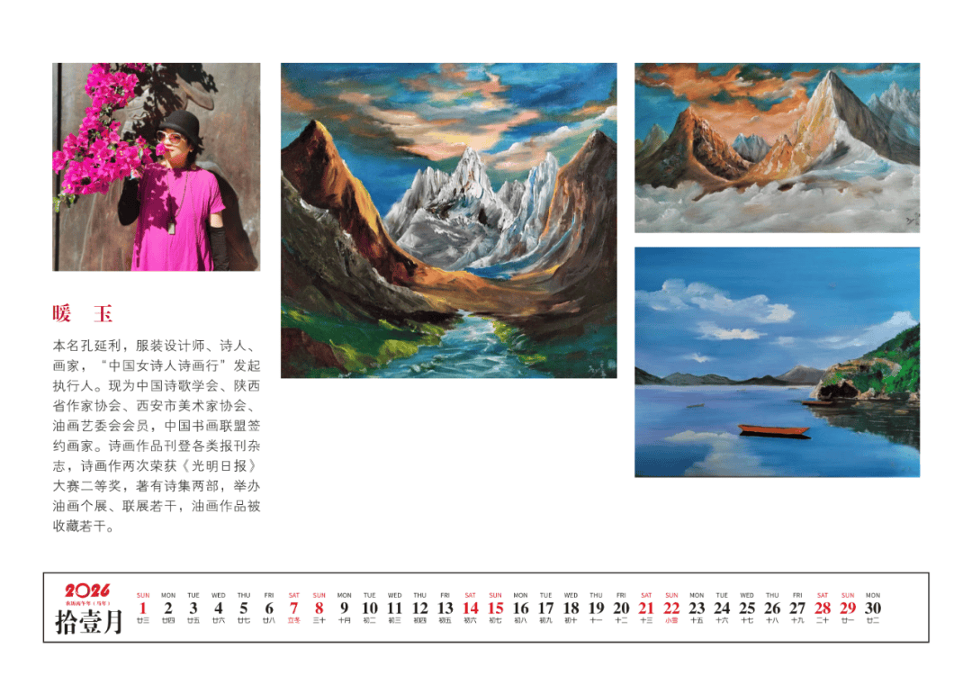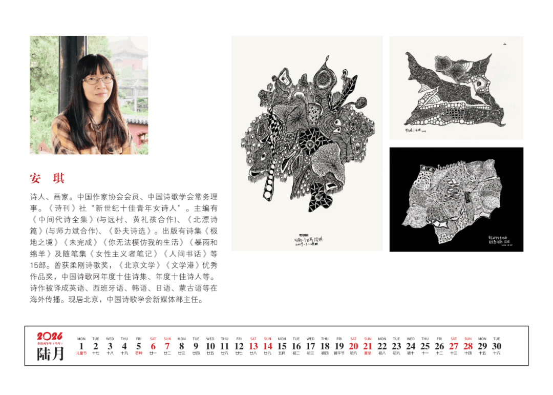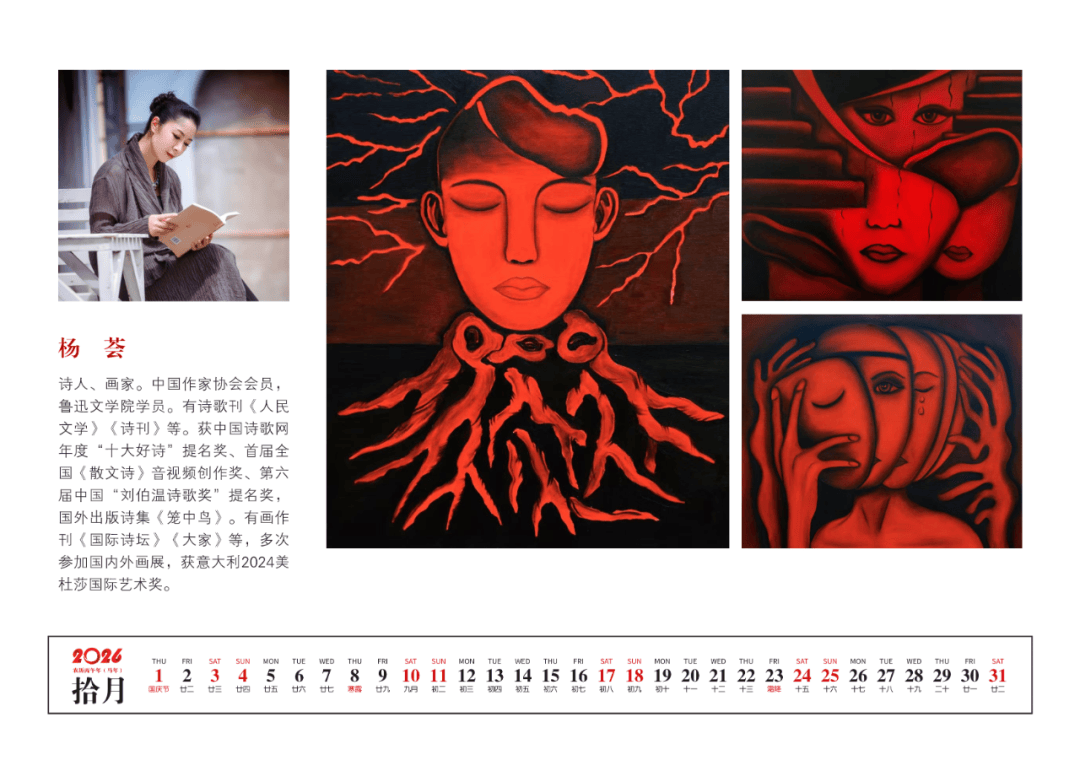 这本年历可谓独具匠心,让人在举首之间感受到诗书画的交融,墨香与色彩的共舞,精神与诗意的远游。方寸天地间,每一幅画皆可入诗,每一笔书法皆似琴音,每一行诗句均绽放出美的神韵。转眼一年飞逝,悲与喜,苦与乐,皆在这一点一线、一笔一划、一字一诗中徜徉。愿我们沉浸在书香画趣里,为诗意的生活增添一抹高雅的亮色。