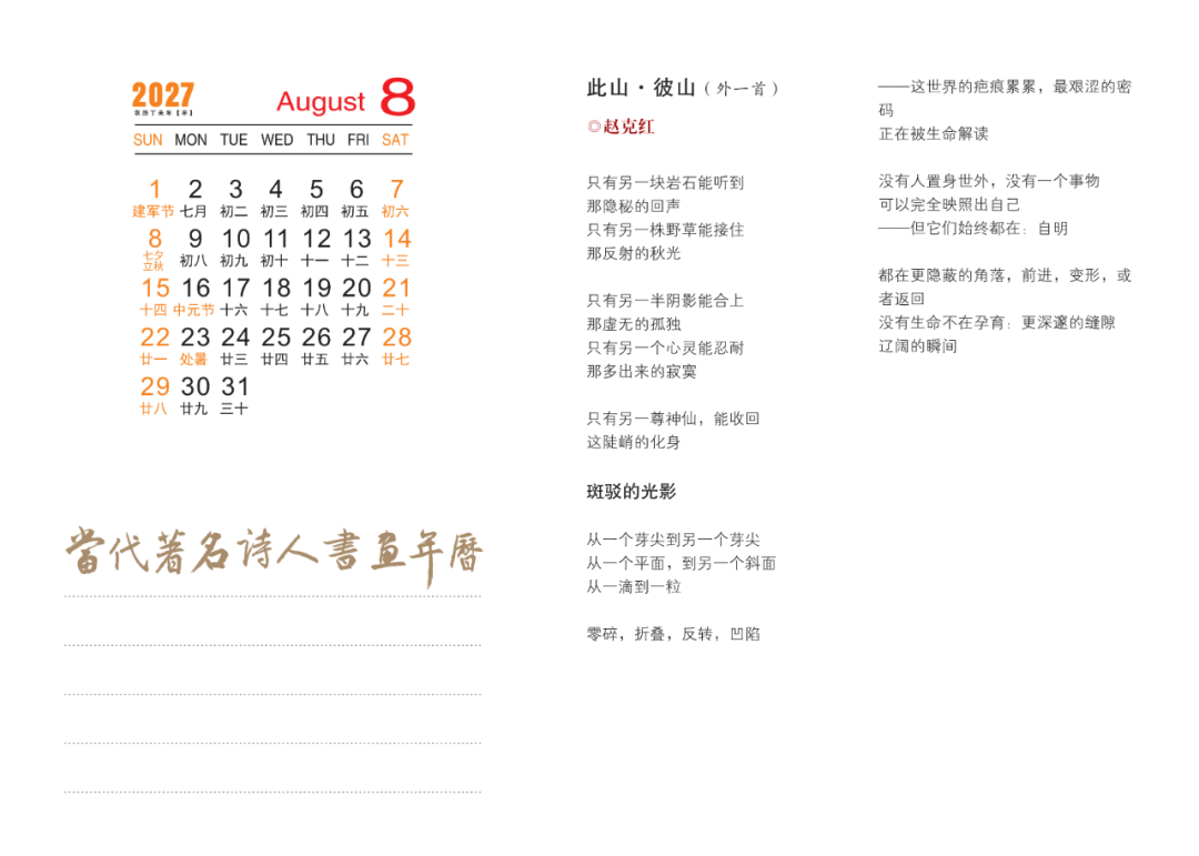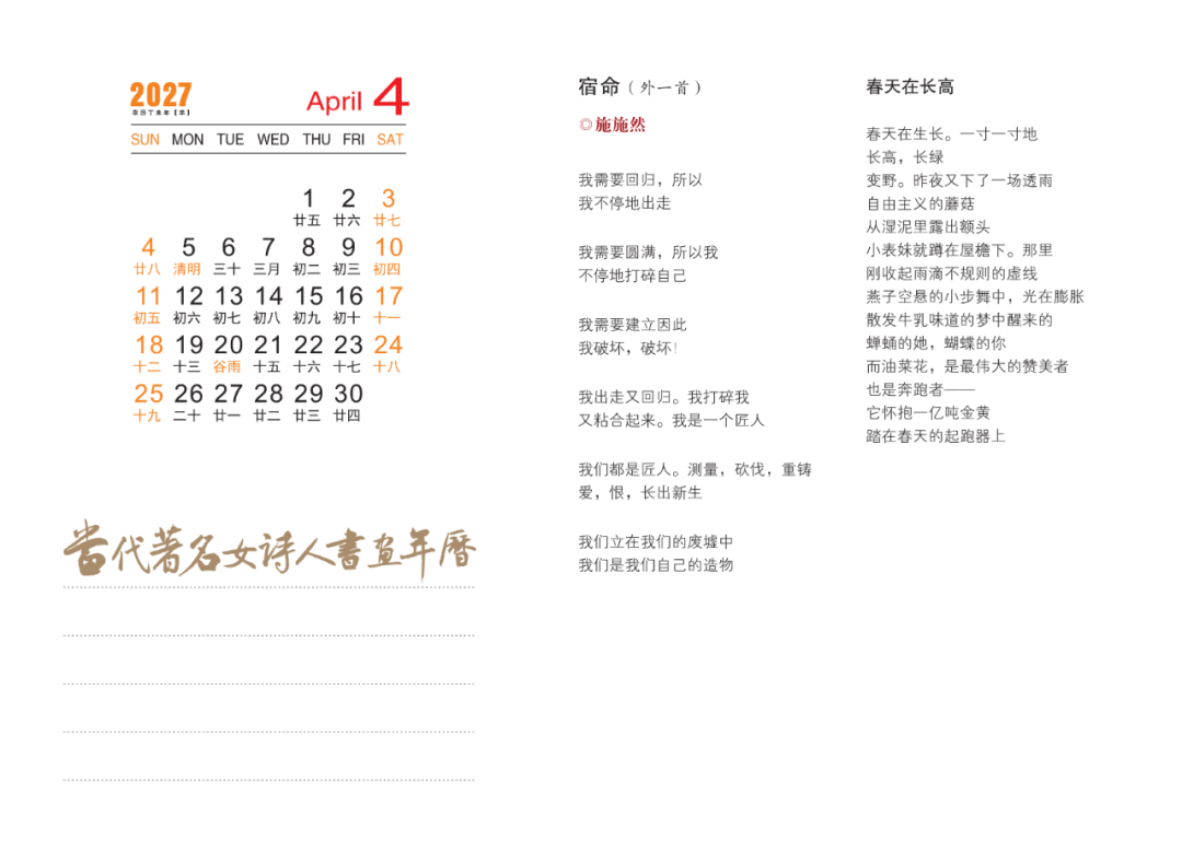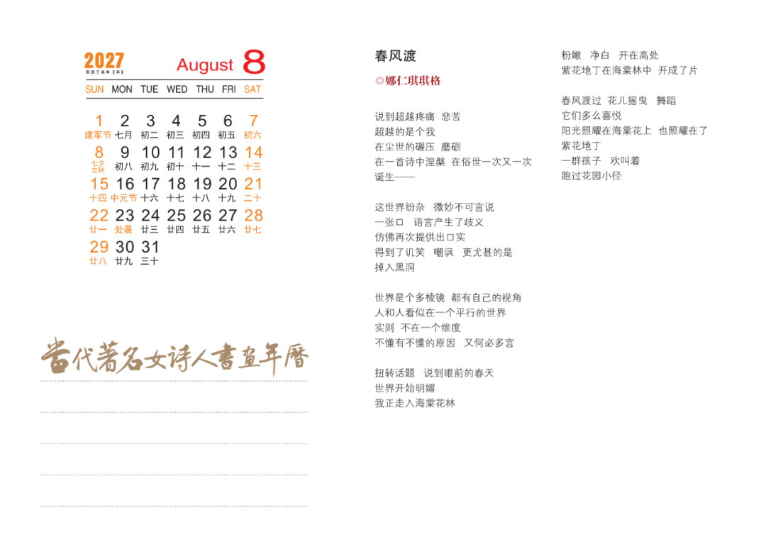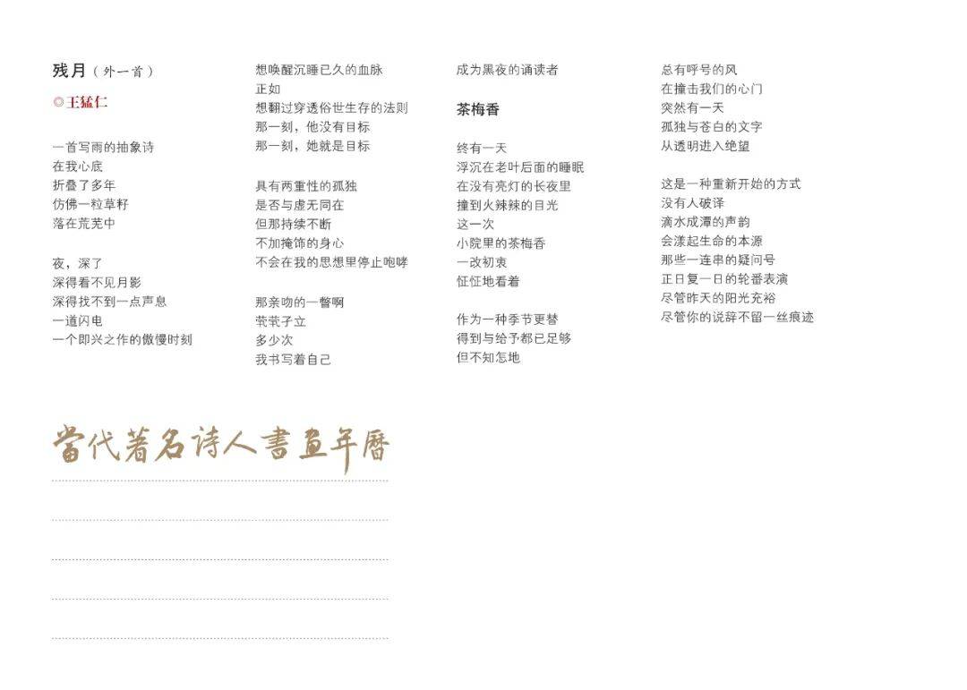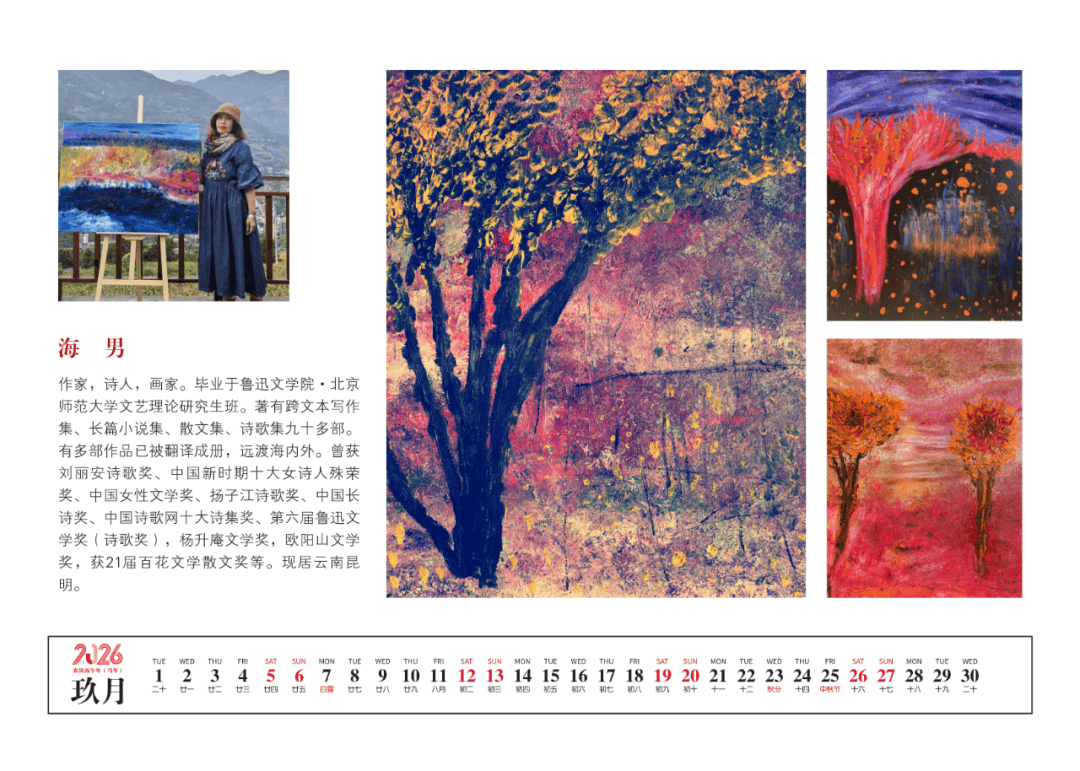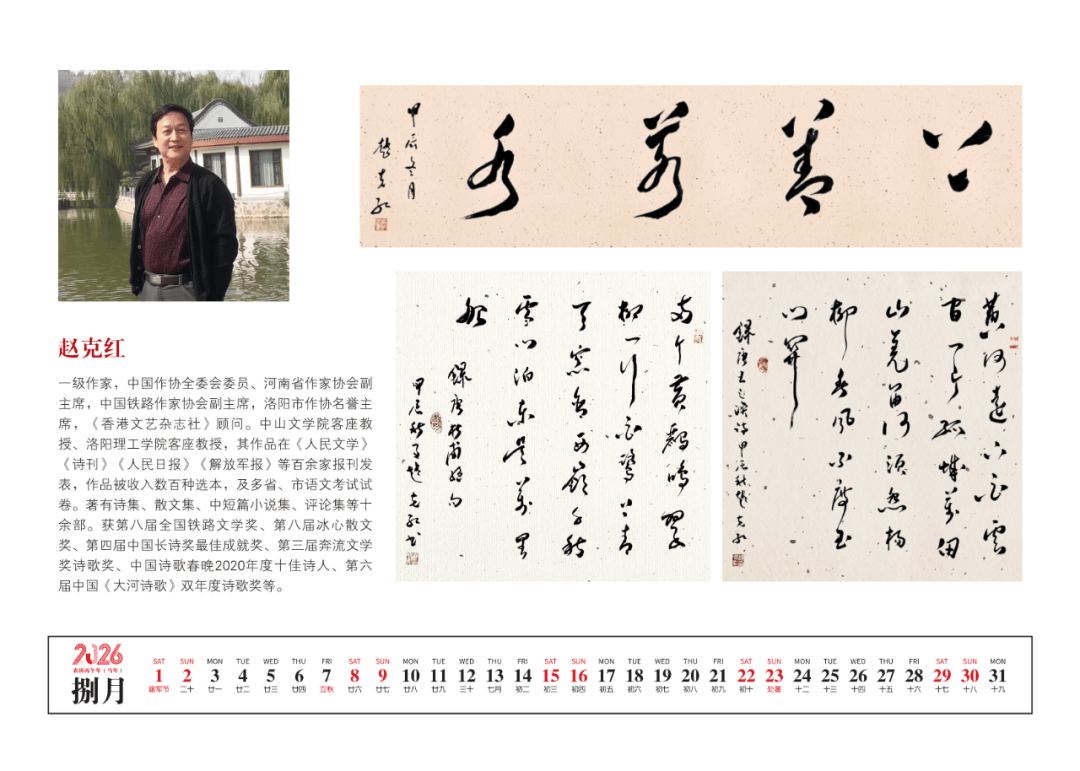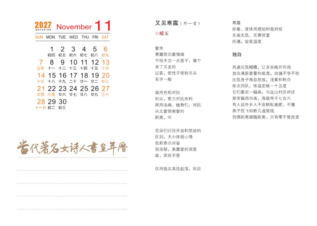 这本年历可谓独具匠心,让人在举首之间感受到诗书画的交融,墨香与色彩的共舞,精神与诗意的远游。方寸天地间,每一幅画皆可入诗,每一笔书法皆似琴音,每一行诗句均绽放出美的神韵。转眼一年飞逝,悲与喜,苦与乐,皆在这一点一线、一笔一划、一字一诗中徜徉。愿我们沉浸在书香画趣里,为诗意的生活增添一抹高雅的亮色。