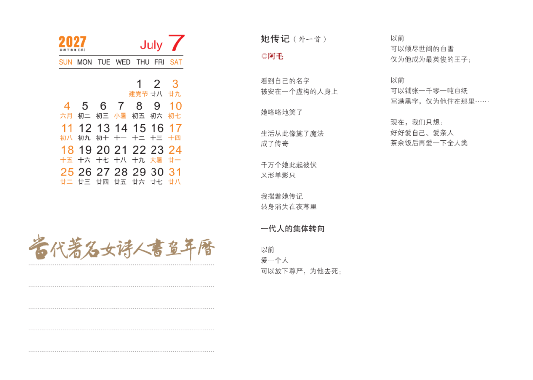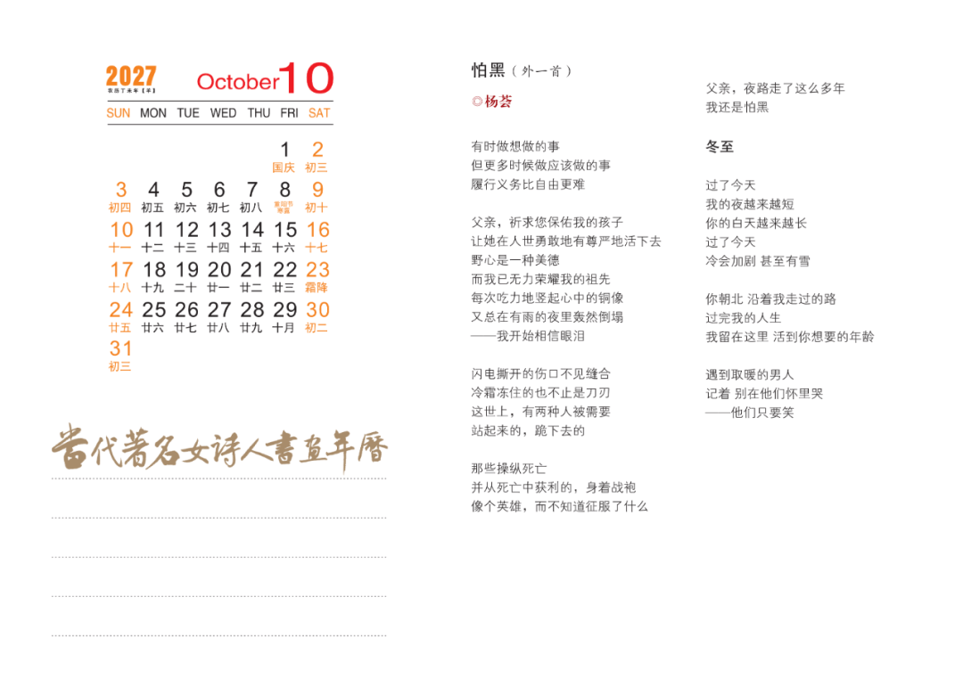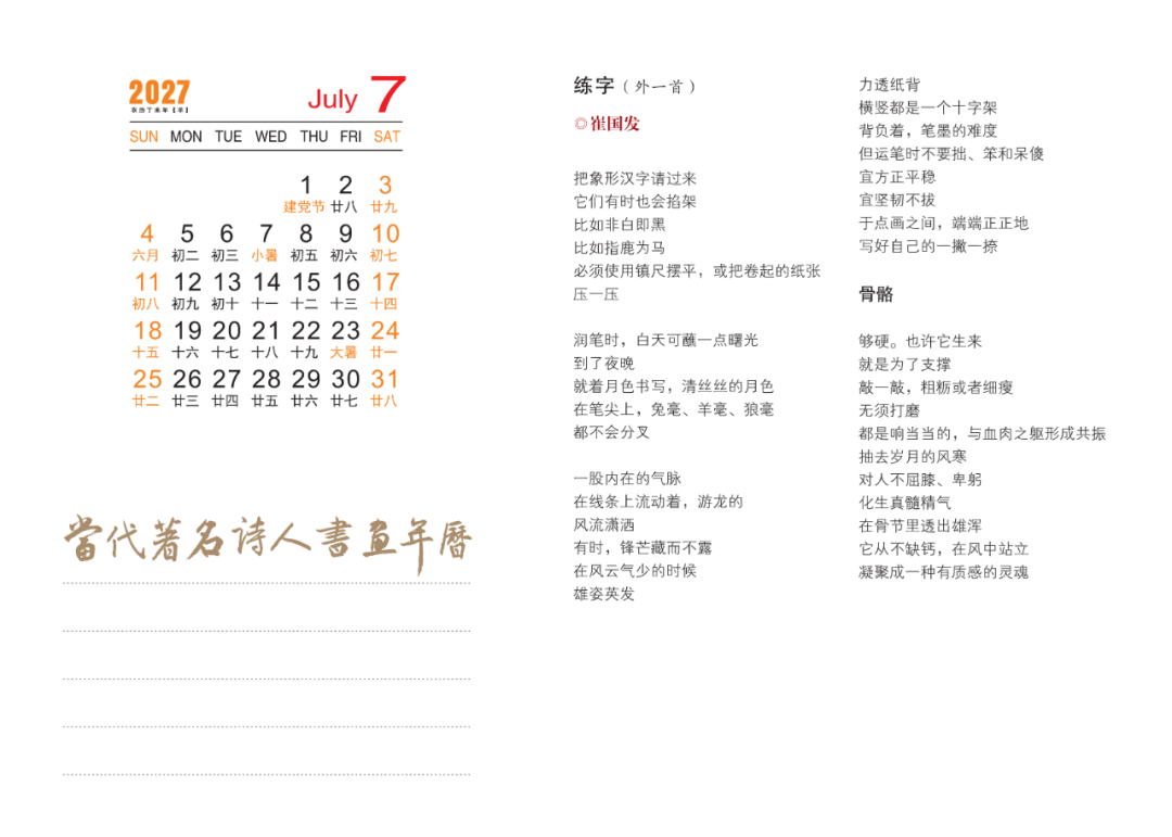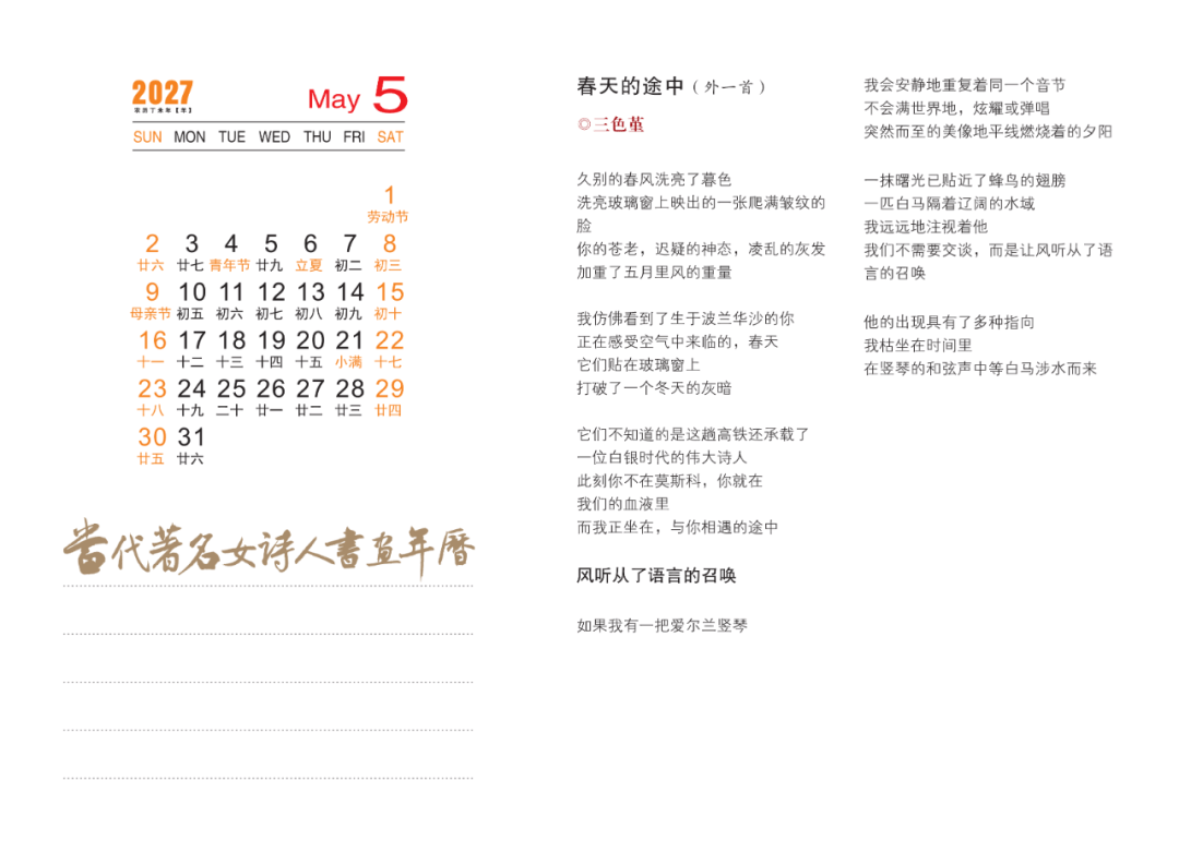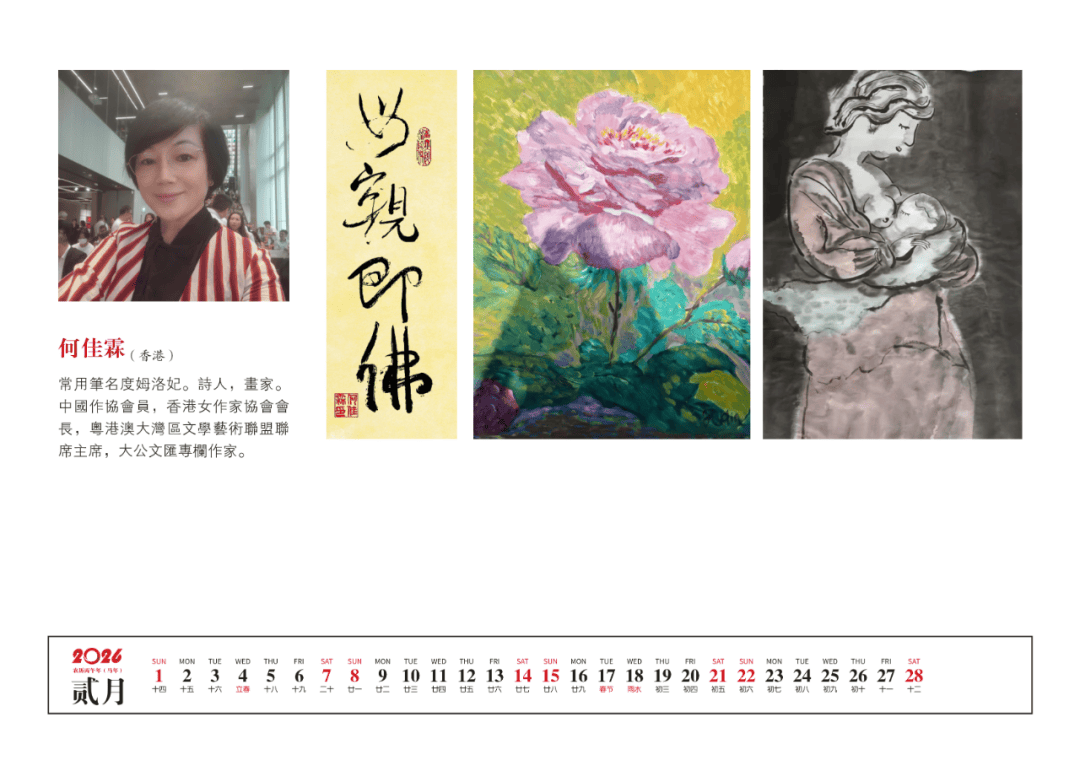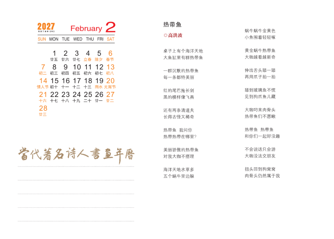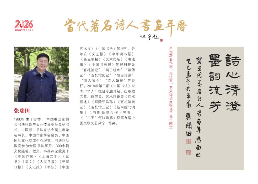 这本年历可谓独具匠心,让人在举首之间感受到诗书画的交融,墨香与色彩的共舞,精神与诗意的远游。方寸天地间,每一幅画皆可入诗,每一笔书法皆似琴音,每一行诗句均绽放出美的神韵。转眼一年飞逝,悲与喜,苦与乐,皆在这一点一线、一笔一划、一字一诗中徜徉。愿我们沉浸在书香画趣里,为诗意的生活增添一抹高雅的亮色。