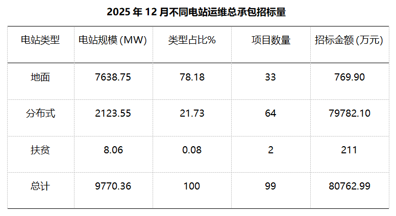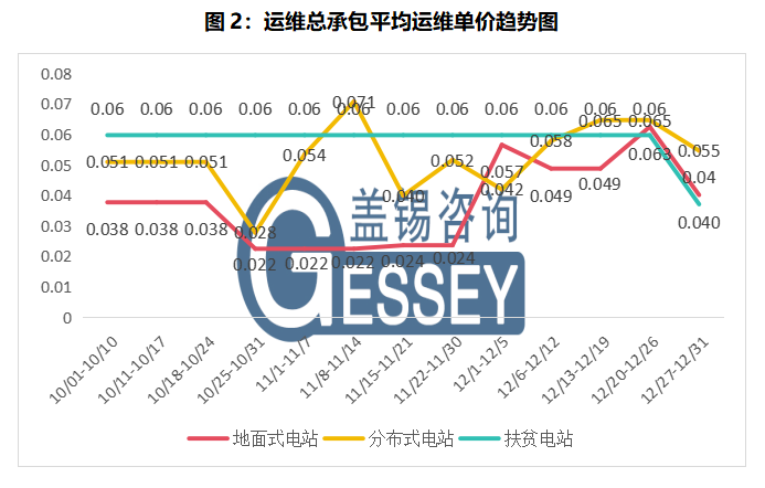 在运维总承包中标项目中,地面式电站本月中标金额为296509.56万元,平均运维单价为0.05元/W/年;分布式电站中标金额为14430.34万元,平均运维单价为0.06元/W/年;扶贫电站总服务中标金额为300907.40万元,平均运维单价为0.04元/W/年。