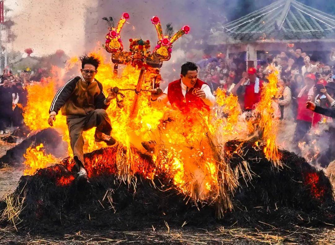 老爷跳火堆的时候,火苗舔过老爷全身,看的人捏了一把汗,即为老爷,也为抬老爷的人。冲出火场的那一刻,大有一种浴火焚身、脱胎换骨的感觉。别的老爷是在过年,这里的老爷是在渡劫啊!不过,这也是典詹村的硬核年味儿,也寓意典詹村的日子会越来越红火。