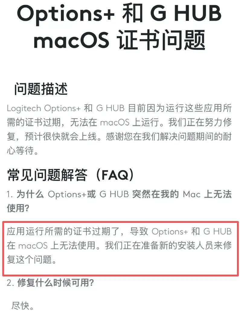 原因很简单——罗技在苹果系统上的应用证书过期,忘续签了。