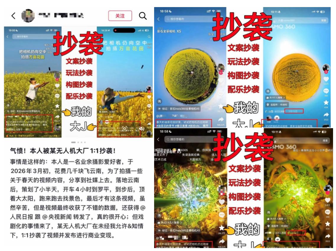 更具争议的是,有博主公开发帖,指控大疆官方宣传片“像素级1:1”抄袭其用影石全景相机拍摄的视频,且在未授权情况下用于商业用途,文案、玩法、构图、配乐完全一致。对此,有网友犀利点评:“大疆一边打官司说别人侵权,一边抄别人的视频,堪称回旋镖打自己。”